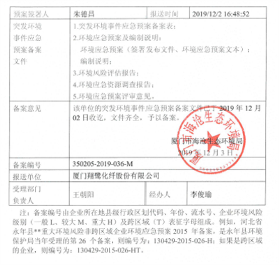 翔鷺化纖突發(fā)環(huán)境事件應急預案備案表及備案批復